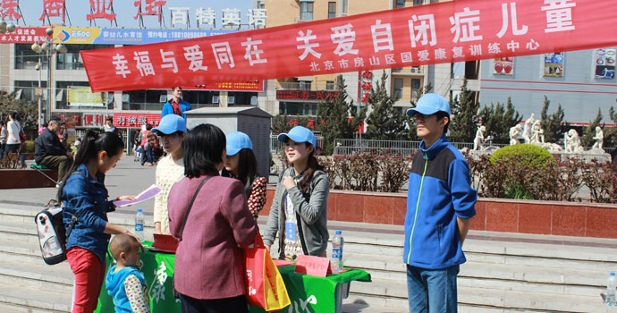 2014年3月30日日,北京市房山区国爱康复训练中心联合北京理工大学大学生志愿者服务队一起到房山区昊天广场和区政府广场进行世界自闭症日主题宣传活动,旨在提高人们对自闭症和自闭症患者的关注,呼吁社会更加深入认识自闭症,了解自闭症,并给予自闭症儿童提供一个公平、包容、关爱的社会环境。