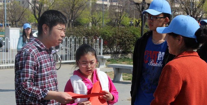 昊天广场宣传队伍,志愿者们向咨询者讲解自闭症知识