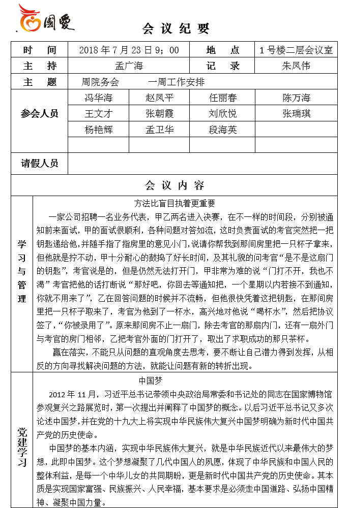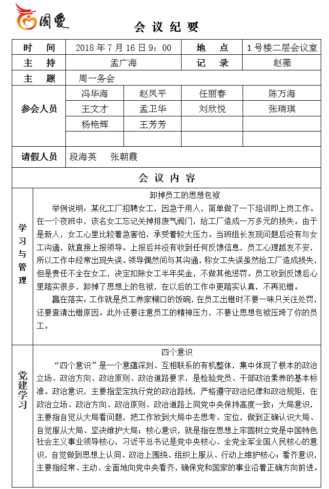 国爱中心党支部按照区委社工委的整体布置.积极组织开展各类学习活动。党支部认真落实“三会一课”制度,夯实党建基础,促进支部建设,健全党组织的生活,严格党员管理,加强党员干部的学习教育,持续开展“两学一做”活动,保持党组织的先进性和纯洁性。党支部围绕中心工作的整体情况,进一步拓展学习形式,坚持每周一例会,组织党员干部积极分子及管理人员学习十九大。大大的提升了管理团队的政治意识和整体素质,使我们每一名党员、干部的学习意识不断增强,政治意识不断提高,.