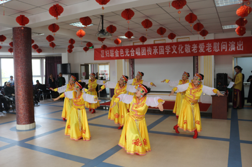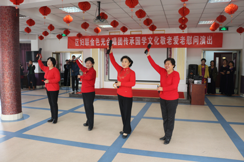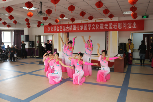 2016年11月11日房山区妇联金色光合唱团传承国学文化敬老爱老慰问演出在国爱老年人服务中心举行。金色光合唱团是我区退休女干部组成的合唱团,给老人们带来了老年模特表演、蒙古舞、和歌曲,受到了中心老人们的欢迎,演出后金色光合唱团又向国爱老年人服务中心捐赠了特仑苏牛奶和橘子。