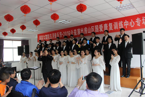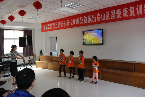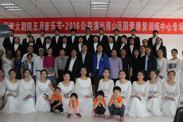 —2016公益演出房山区国爱康复训练中心专场 2016年5月4日下午,国家大剧院五月音乐节—2016公益演出在房山国爱康复训练中心举行。市残联、区残联和阎村镇的领导参加了此次活动。国家大剧院的演出人员给康复中心的家长和孩子演唱了歌曲《我的祖国》、《一剪梅》、《南泥湾》等好听的歌曲,国爱康复中心的小朋友也给大家表演了舞蹈《小鱼游游游》,台下的观众给予了热烈的掌声,活动非常圆满。最后国家大剧院的演员和参加活动的领导及孩子们一起合影留念。